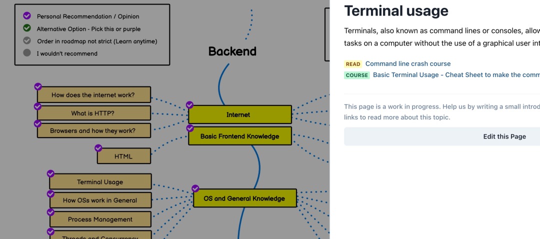 针对于每一个技术工种,它都提供了一幅长长的,可以交互的图,让你对自己的计算机水平有一个大的把握,同时提供一些延伸的学习资料。