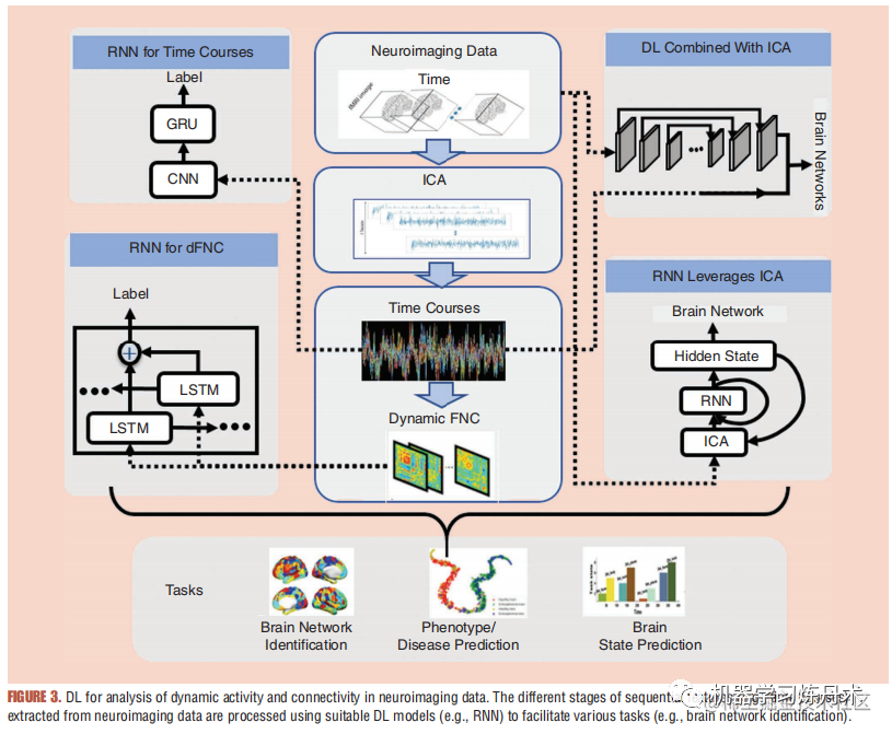 此外RNN-ICA提出了结合RNN和ICA使用方案,which can explicitly optimize linear generative models to model temporal dynamics and infer intrinsic networks from time-series observations (the network structure and identified spatial maps are shown in RNN leverages ICA in figure 3)