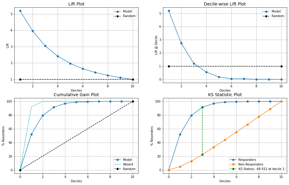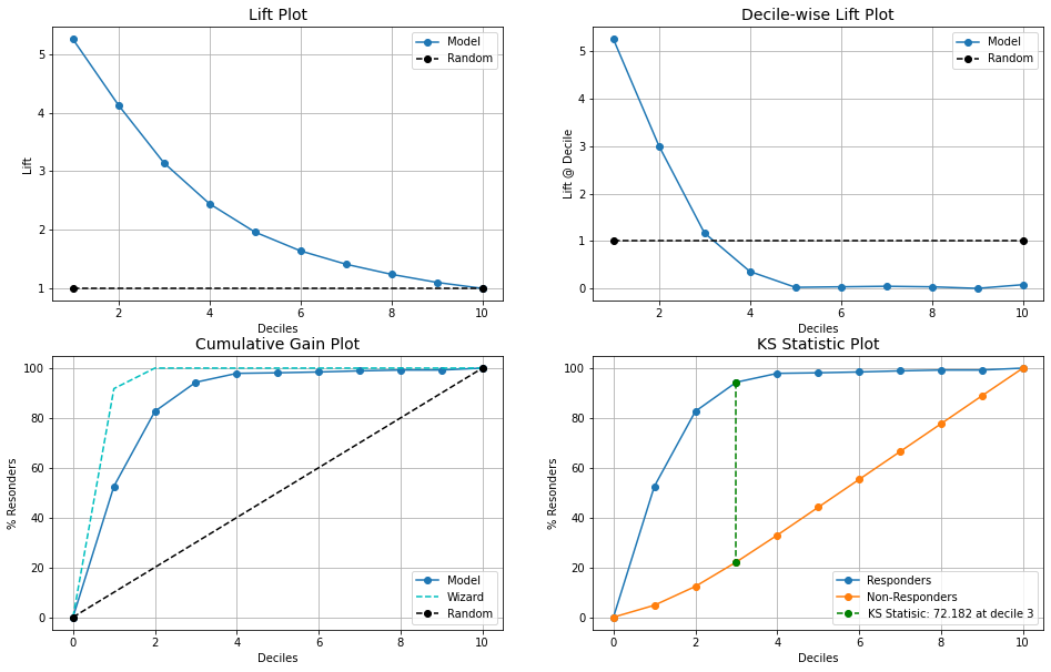 到目前为止,我们已经讨论了模型、十分位数及其性能比较。让我们在十分位数级别上进一步探讨这一点,以更清楚地了解发生了什么以及我们如何更好地解释这个过程。我们将在视觉效果的帮助下进行分析,这使它变得更加容易。kds 包有一个非常好的功能,可以在一行代码中生成所有指标报告。