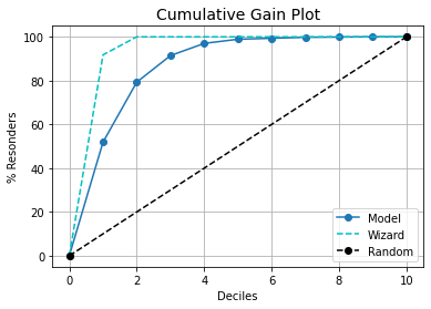 我们将在累积增益图中可视化上述模型。展现逻辑回归的性能。