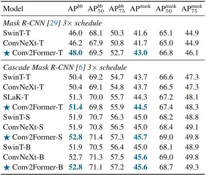 如下图10所示是不同骨干网络,以 Mask R-CNN 为检测头和 Cascade Mask R-CNN 为实例分割头在 COCO 数据集的实验结果。训练策略遵循 ConvNeXt。对于小模型,使用 Mask R-CNN 框架时,Conv2Former-T 比 SwinT-T 和 ConvNeXt-T 获得了约 2% AP 的改进。