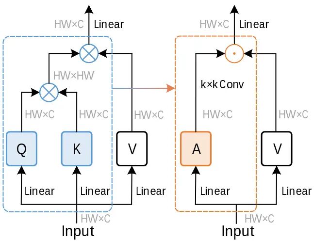 本文的关键就是本小节介绍的卷积调制模块。如下图1所示, 对于传统的 Self-attention, 给定一个序列长度为 的输入 , 自注意力模块首先通过线性层得到 key , query , 和 value , 其中 是通道数。 和 是输入的空间大小。输出是注意力矩阵 (本质是相似度得分矩阵)