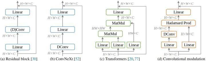 本文试图回答:如何借助卷积操作,打造具有 Transformer 风格的卷积网络视觉基线模型。本文提出一种卷积调制模块,利用卷积来建立关系,这比注意力机制在处理高分辨率图像时更高效。最终的模型称为 Conv2Former,它通过只使用卷积和 Hadamard 积,简化了注意力机制。卷积调制操作是一种利用大核卷积的更有效的方法。作者在 ImageNet 分类、目标检测和语义分割方面的实验也表明,Conv2Former 比以前基于 CNN 的模型和大多数基于 Transformer 的模型表现得更好。