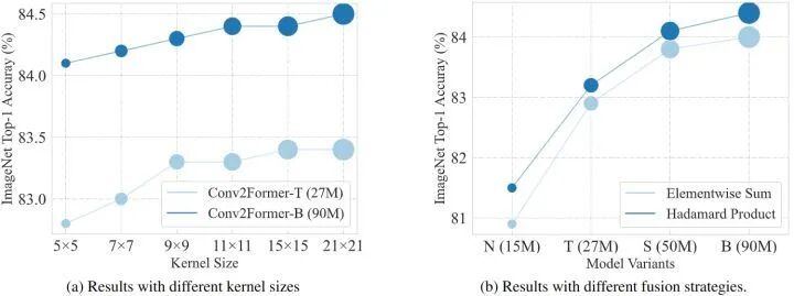 图1:卷积调制模块示意图ConvNeXt 表明,将 ConvNets 的核大小从3扩大到7可以提高分类性能。然而,进一步增加 Kernel 的大小几乎不会带来性能上的提升,反而会在没有重新参数化的情况下增加计算负担。但作者认为,使 ConvNeXt 从大于 7×7的 Kernel Size 中获益很少的原因是使用空间卷积的方式。对于 Conv2Former,当 Kernel Size 从 5×5 增加到 21×21 时,可以观察到一致的性能提升。这种现象不仅发生在 Conv2Former-T (82.8→83.4) 上,也发生在参数为80M+ 的 Conv2Former-B (84.1→84.5) 上。考虑到模型效率,默认的 Kernel Size 大小可以设置为 11×11。