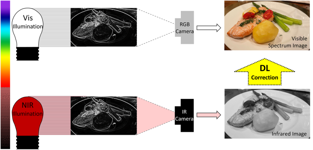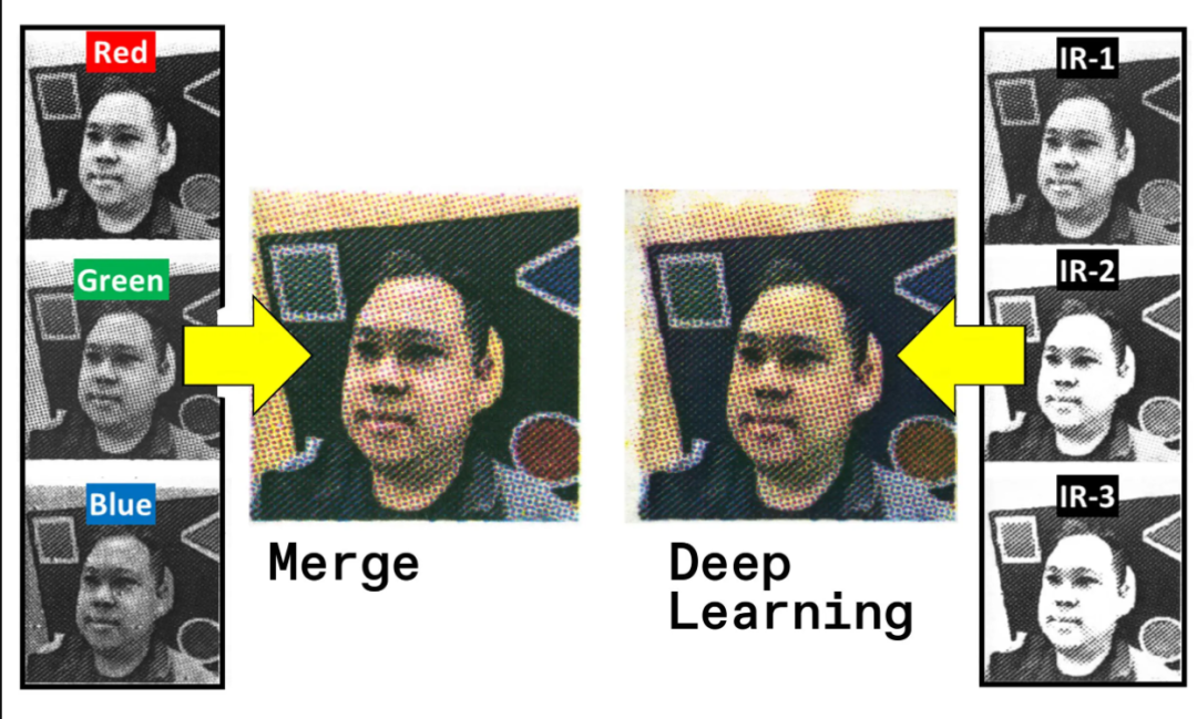 在一些军事大片中,士兵头戴夜视仪搜索前进似乎是少不了的场景。使用红外光在黑夜中观察的夜视系统通常将视物渲染成单色图像。不过,在最近的一项研究中,加州大学欧文分校的科学家们借助深度学习 AI 技术设计了一新方法,有了这种方法,红外视觉有助于在无光条件下看到场景中的可见颜色。研究共同一作、加州大学欧文分校工程师、外科医生和视觉科学家 Andrew Browne 表示,「世界上很多地方都以人们赖以做出决策的方式进行颜色编码,比如信号灯。」夜视系统是个特例。使用红外光照亮黑夜的夜视系统通常仅以绿色渲染场景,而无法显示出在正常光线下可见的颜色。一些较新的夜视系统使用超灵敏相机放大可见光,但这些相机几乎不能显示出漆黑环境中没有光可放大的颜色。因此,在这项研究中,研究者推断,赋予物体可见光的每种染料和颜料不仅反射了一组可见波长,而且可能反射一组红外波长。那么,如果可以训练一个能够识别每种染料和颜料的红外指纹的夜视系统,则能够使用与每种染料和颜料相关的可见光来显示图像。