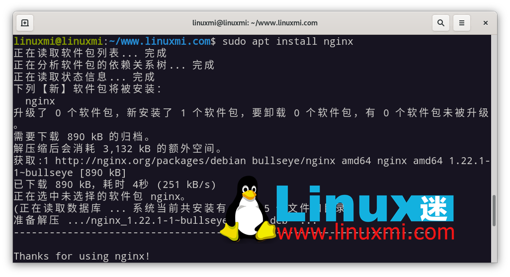 linuxmi@linuxmi:~/www.linuxmi.com$ sudo apt install nginx