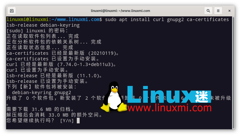 下载应用程序时安装 gnupg2 以获得安全的通信通道。linuxmi@linuxmi:~/www.linuxmi.com$ sudo apt install curl gnupg2 ca-certificates lsb-release debian-keyring