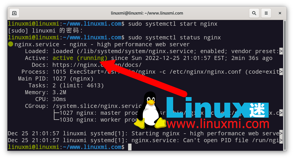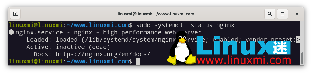 如果它未处于活动状态,请通过发出 sudo systemctl status nginx 命令来启动它:linuxmi@linuxmi:~/www.linuxmi.com$ sudo systemctl status nginx