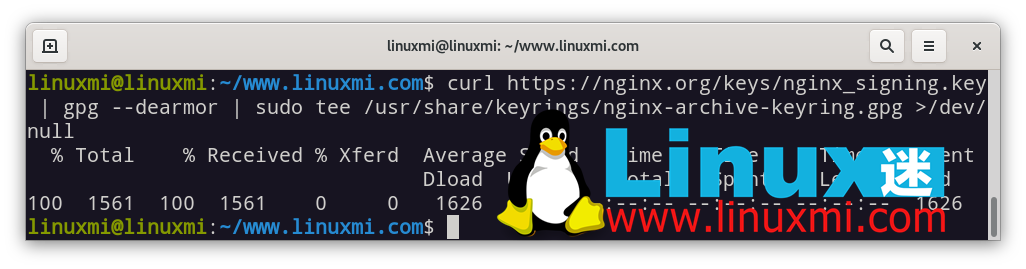 接下来,您应该从 Nginx 获取官方签名密钥以验证软件包的真实性。linuxmi@linuxmi:~/www.linuxmi.com$ curl https://nginx.org/keys/nginx_signing.key | gpg --dearmor | sudo tee /usr/share/keyrings/nginx-archive-keyring.gpg >/dev/null