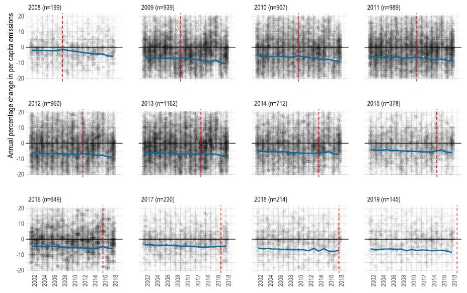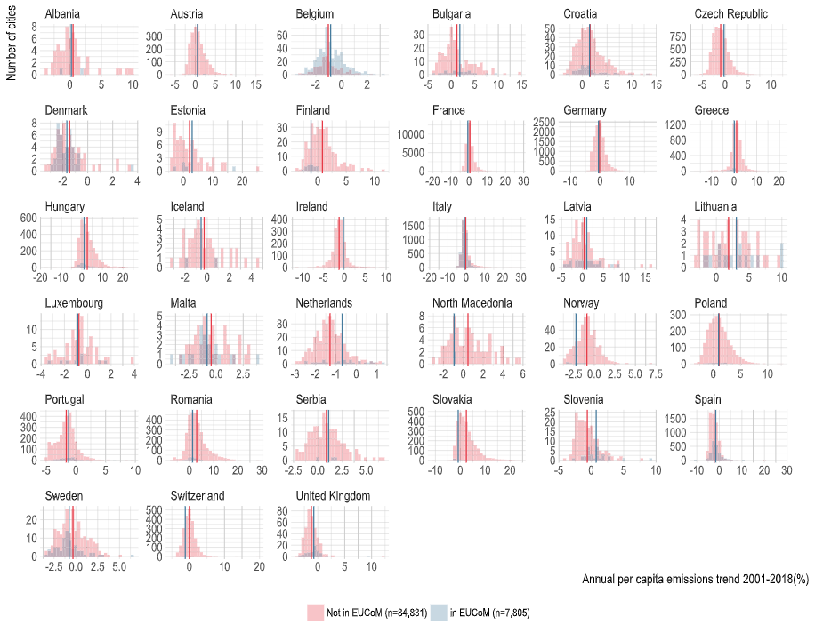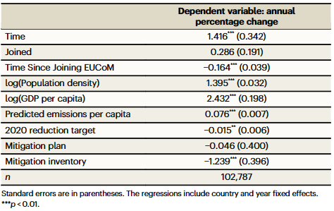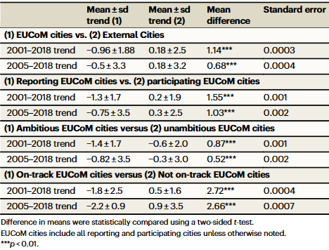 学者们认为,城市参与跨国气候治理“可以在一定条件下加快其遏制温室气体排放的行动”。支持这一说法的证据很少,因此很难准确预测什么条件会产生这种影响。跨国气候举措通常要求报告气候行动计划,并以排放清单的形式进行定期监测,以评估是否实现了缓解目标,但实际上只有一小部分国家以下行为者符合这些要求。Hsu等人发现,在9000多个签署了《欧盟气候与能源市长公约》(EUCoM)倡议的城市中,只有约15%的城市报告了任何排放数据,更少的城市(约11%)报告了基线排放清单和额外一年的清单排放数据,以跟踪自愿减排目标的进展。当排放数据可用时,由于数据点的可用性有限,基本方法普遍缺乏透明度,以及缺乏标准化的会计方法,这些数据往往无法比较。Ibrahim等人评估了七个不同城市规模的温室气体排放清单协议和方法,并得出结论,城市需要一个共同的报告标准或方法。必须解决各种标准定义的差异,例如,排放范围,特别是范围供应链排放,以便参与者的排放数据可以进行适当比较。