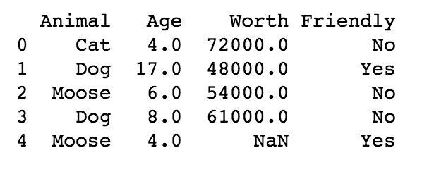 记住,在查看数据集的时候,索引(index)是从 0 开始的。所以,如果希望统计列数,从 0 开始计数而不是 1。「[:, :3]」会返回 animal、age 和 worth 三列。其中 0 表示 animal,1 表示 age,2 表示 worth。对于这种计数方法,即使你没见过,也会在很短的时间内适应。