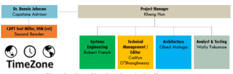 图3描述了时区团队(Team Time Zone)的组织结构和每个团队成员的主要职责。图中还显示了NPS的项目顾问,Bonnie Johnson博士(系统工程系)和美国海军上尉Scot Miller(退役)(信息科学系)。