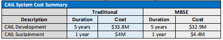 Team Time Zone进行了成本分析,以估计为DON实施CAIL系统的成本。该团队使用了两种方法来估计成本:传统的成本估计和基于模型的系统工程(MBSE)方法。该小组估计CAIL系统的成本(基于传统的成本估算)为3380万美元,持续时间为5年,每年的重复维持成本为400万美元。团队估算的CAIL系统成本(基于MBSE方法),在运行了一万次蒙特卡洛模拟后,平均为3290万美元,持续时间为5年。运营和维护模型的平均成本为每年440万美元。表1显示了CAIL开发和维护成本的摘要。