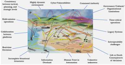 技术的进步给军事领域带来了新的威胁类型和现有威胁的改进版本。对抗性威胁的进步要求海军改进现有的能力并开发新的能力,以提高防御能力并应对这些威胁。能力的增强需要提高速度、隐身性、机动性、反措施、扩大范围、更早发现和更大的杀伤力。这些增强的能力使我们能够在不确定的、复杂的和时间紧迫的条件下做出关键决定。现代战术作战人员面临着越来越复杂的决策空间。他们需要获得对动态战斗空间的态势感知,并确定有效的行动方案(COA)以满足任务需求。图1强调了造成这种战术复杂决策空间的因素。决策的复杂性来自于威胁环境,来自于知识的不确定性,来自于战争和信息系统本身,来自于作战人员与自动化系统和信息系统的互动和使用所产生的挑战,以及任务决策的重要性或后果的严重性。