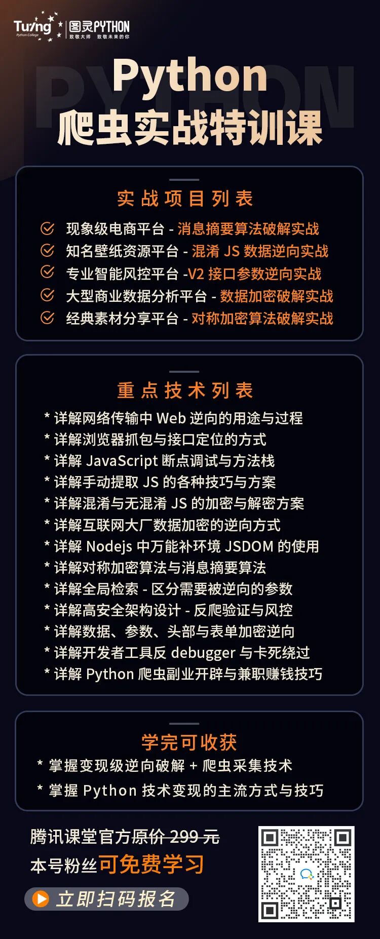这是一套专讲爬虫逆向破解的高阶技术实战课,迄今为止已帮助超三万学员快速进阶。本次课程将由国际大数据竞赛获奖大佬亲身指导,带领大家进行一线大厂高阶技术体系+多重逆向解析项目实战+技术变现路径指导的综合速成训练!