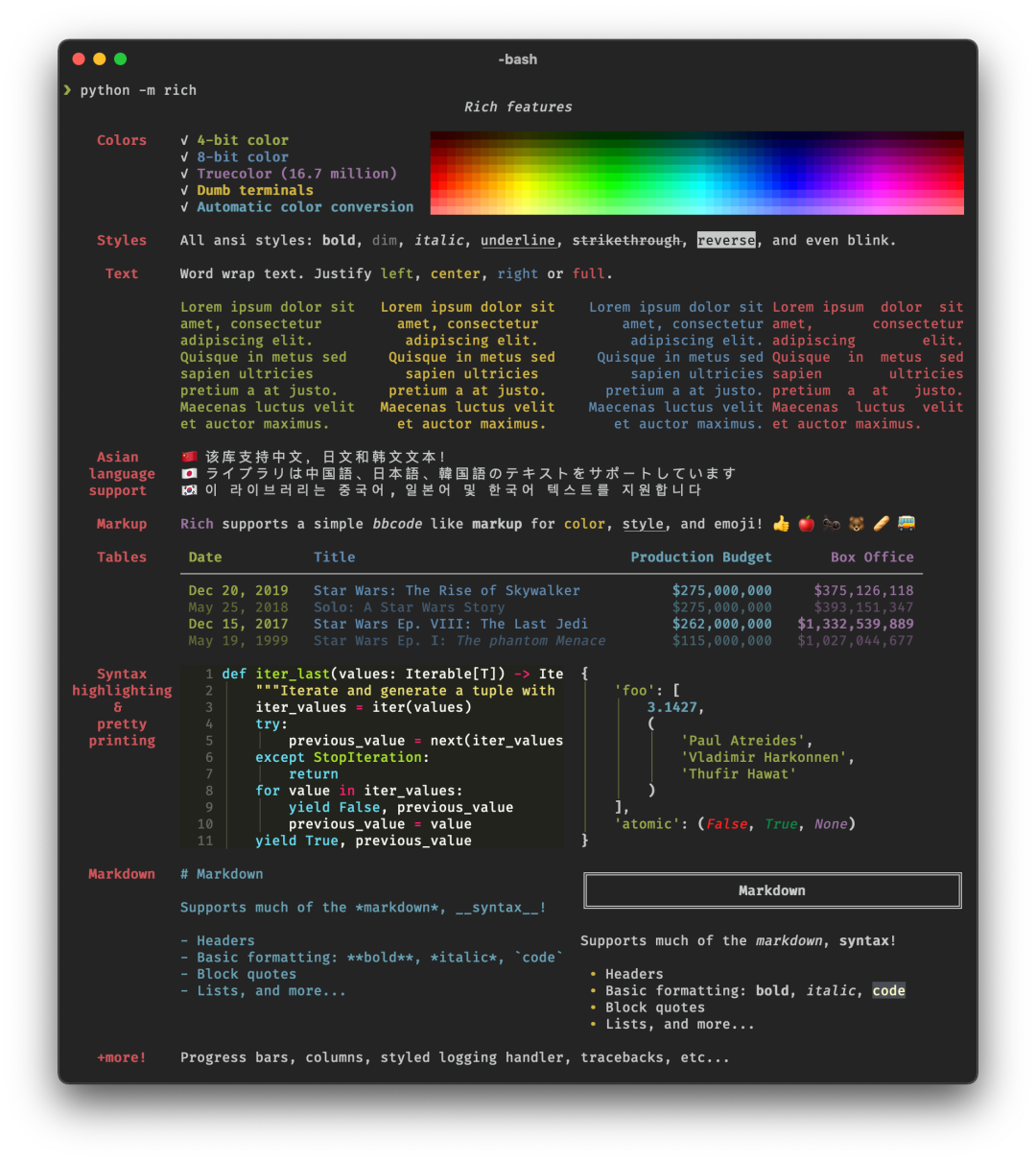 使用 Rich API 可以很容易的在终端输出添加各种颜色和不同风格。它可以绘制漂亮的表格,进度条,Markdown,突出显示语法