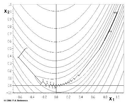 首先,选择一个接近函数 f (x)零点的 x0,计算相应的 f (x0) 和切线斜率f (x0)(这里f 表示函数 f 的导数)。然后我们计算穿过点(x0, f (x0)) 并且斜率为f (x0)的直线和 x 轴的交点的x坐标,也就是求如下方程的解: 我们将新求得的点的 x 坐标命名为x1,通常x1会比x0更接近方程f (x) = 0的解。因此我们现在可以利用x1开始下一轮迭代。迭代公式可化简为如下所示: 已经证明,如果f 是连续的,并且待求的零点x是孤立的,那么在零点x周围存在一个区域,只要初始值x0位于这个邻近区域内,那么牛顿法必定收敛。并且,如果f (x)不为0, 那么牛顿法将具有平方收敛的性能. 粗略的说,这意味着每迭代一次,牛顿法结果的有效数字将增加一倍。 由于牛顿法是基于当前位置的切线来确定下一次的位置,所以牛顿法又被很形象地称为是"切线法"。牛顿法的搜索路径(二维情况)如下图所示:
