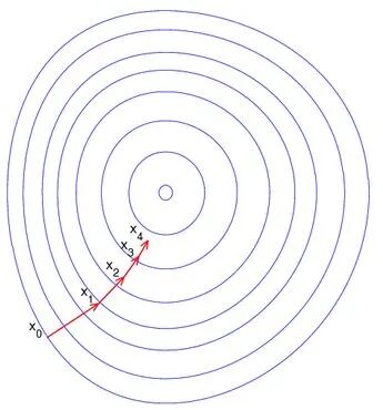 梯度下降法是最早最简单,也是最为常用的最优化方法。梯度下降法实现简单,当目标函数是凸函数时,梯度下降法的解是全局解。一般情况下,其解不保证是全局最优解,梯度下降法的速度也未必是最快的。梯度下降法的优化思想是用当前位置负梯度方向作为搜索方向,因为该方向为当前位置的最快下降方向,所以也被称为是”最速下降法“。最速下降法越接近目标值,步长越小,前进越慢。梯度下降法的搜索迭代示意图如下图所示: