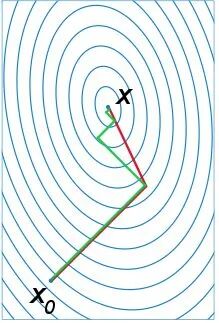 从本质上去看,牛顿法是二阶收敛,梯度下降是一阶收敛,所以牛顿法就更快。如果更通俗地说的话,比如你想找一条最短的路径走到一个盆地的最底部,梯度下降法每次只从你当前所处位置选一个坡度最大的方向走一步,牛顿法在选择方向时,不仅会考虑坡度是否够大,还会考虑你走了一步之后,坡度是否会变得更大。所以,可以说牛顿法比梯度下降法看得更远一点,能更快地走到最底部。(牛顿法目光更加长远,所以少走弯路;相对而言,梯度下降法只考虑了局部的最优,没有全局思想。) 根据wiki上的解释,从几何上说,牛顿法就是用一个二次曲面去拟合你当前所处位置的局部曲面,而梯度下降法是用一个平面去拟合当前的局部曲面,通常情况下,二次曲面的拟合会比平面更好,所以牛顿法选择的下降路径会更符合真实的最优下降路径。注:红色的牛顿法的迭代路径,绿色的是梯度下降法的迭代路径。 缺点:牛顿法是一种迭代算法,每一步都需要求解目标函数的Hessian矩阵的逆矩阵,计算比较复杂。 2)拟牛顿法(Quasi-Newton Methods) 拟牛顿法是求解非线性优化问题最有效的方法之一,于20世纪50年代由美国Argonne国家实验室的物理学家W.C.Davidon所提出来。Davidon设计的这种算法在当时看来是非线性优化领域最具创造性的发明之一。不久R. Fletcher和M. J. D. Powell证实了这种新的算法远比其他方法快速和可靠,使得非线性优化这门学科在一夜之间突飞猛进。 拟牛顿法的本质思想是改善牛顿法每次需要求解复杂的Hessian矩阵的逆矩阵的缺陷,它使用正定矩阵来近似Hessian矩阵的逆,从而简化了运算的复杂度。拟牛顿法和最速下降法一样只要求每一步迭代时知道目标函数的梯度。通过测量梯度的变化,构造一个目标函数的模型使之足以产生超线性收敛性。这类方法大大优于最速下降法,尤其对于困难的问题。另外,因为拟牛顿法不需要二阶导数的信息,所以有时比牛顿法更为有效。如今,优化软件中包含了大量的拟牛顿算法用来解决无约束,约束,和大规模的优化问题。 拟牛顿法的基本思想如下。首先构造目标函数在当前迭代xk的二次模型: