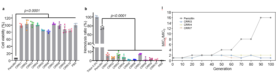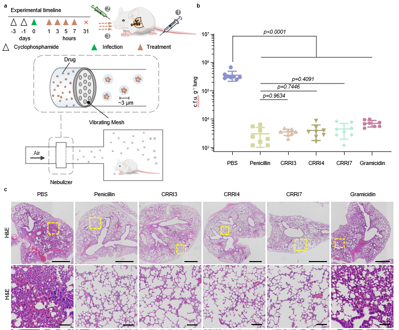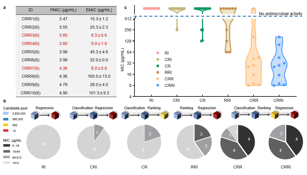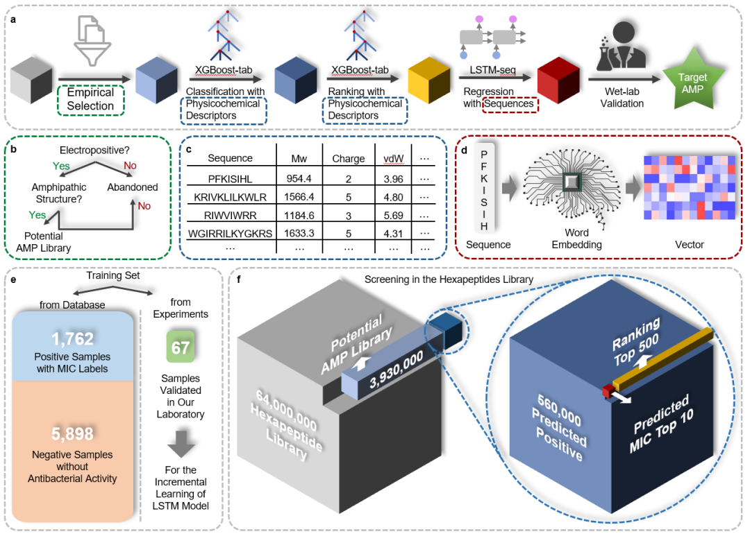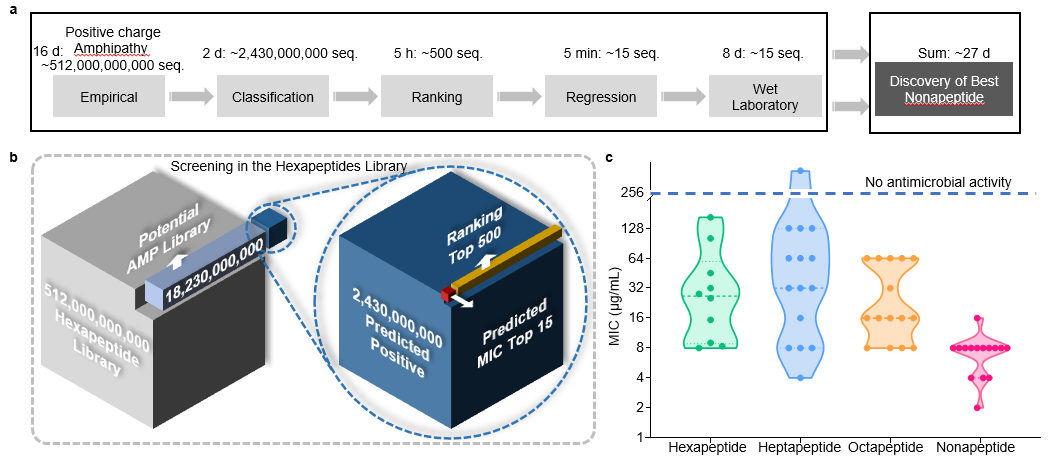具有序列多样性的多肽分子构成了一个近乎无限的潜在药物储藏库。通过噬菌体展示、核糖体展示等高通量实验,最多可实现在10^7-10^15数量级的序列库中进行筛选。抗菌多肽是应对耐药细菌感染的潜在手段。然而针对抗菌多肽,当前最先进的实验技术也仅实现了在80万序列文库中的筛选。浙江大学计剑、赵俊博、张鹏团队针对抗菌肽高通量筛选的问题,建立了一种高效而准确的机器学习方法来实现完整短肽库中抗菌肽的高效识别。具体而言,该工作结合经验判断、分类、排序和回归任务组成的全新机器学习pipeline(SMEP),极短时间内即可实现在含有数千亿候选序列的六肽-九肽全序列文库中抗菌肽的识别。作者对其中3条代表性的抗菌六肽进行了实验研究,其对多种临床分离耐药菌表现出了高杀菌活性,并且脱靶毒性低、不易诱导耐药性,在小鼠细菌性肺炎模型中表现出了良好的治疗效果。该项工作以题为“Identification of potent antimicrobial peptides via a machine-learning pipeline that mines the entire space of peptide sequences”的文章发表于Nature Biomedical Engineering上。黄俊杰博士与徐彦超博士生为文章共同第一作者。1.SMEP概述这项工作通过结合经验判断、分类模型、排序模型、回归模型、增量学习模型修正以及湿实验验证等步骤,探索建立了一种基于SMEP的抗菌肽快速识别方法(图1)。研究以六肽为模型肽进行识别任务,从具有6400万条多肽的六肽全库中识别抗菌肽。在识别工作中,作者首先借助经验判断(正电性;两亲性),生成符合条件的393万多肽子库。接着利用分类模型对393万肽库中的多肽进行分类,得到56万模型预测显示抗菌活性的多肽。然后使用排序模型对这些多肽的抗菌活性进行预排序,并挑选了前500条肽作为最终抗菌肽备选库。最后,使用回归模型对500条肽进行MIC预测,并挑选MIC预测值最低的10条肽(CRRI抗菌肽)进行湿实验验证。图1 SMEP概述2.MIC测试执行SMPE后,获得top-10多肽并测试MIC。全部10条肽均具备抗菌性(图2a)。性能最好的抗菌肽MIC达8 µg/mL。为证明模型设计合理性,尝试删除SMPE中分类、排序模块并重新组合模型输出top-10多肽。图2b,c表明,删除任意模块均会都会严重影响模型预测能力,证明了SMPE设计的合理性。进一步测试多肽对包括临床分离多药耐药菌的MIC,发现与目前报道的最强抗菌六肽MP196相比,识别多肽具有更强的抗菌活性(表1)。图2 MIC测试表1 抗菌肽对各种细菌的MIC测试(黄色区域为临床分离多药耐药菌)3.SMPE泛化与抗菌肽体外测试在未对SMPE进行任何修改的前提下,执行SMPE对七肽、八肽、九肽抗菌肽识别任务。图3a表明了SMPE极高的运算效率,仅需19天即可完成对九肽全文库共5120亿样本的抗菌肽识别任务。汇总六肽-九肽测试结果,识别的54条多肽(共55条)具有抗菌性,SMPE识别成功率高达98.2%。进一步测试了最具应用潜力的抗菌六肽的生物性能,证明了它们极低的脱靶细胞与血液毒性(图4a,b),且不易诱导细菌耐药性(图4i)。图3 SMPE泛化七肽、八肽、九肽抗菌肽图4 抗菌六肽体外测试4.抗菌肽体内治疗测试测试抗菌肽治疗短时间大量细菌感染急性肺炎的能力。采用中性粒细胞缺乏症小鼠建立细菌急性感染模型,再用雾化给药的方式进行治疗(图5a)。经抗菌肽治疗后(CRRI3、4、7组),小鼠肺部细菌减少99.8%(图5b),且肺部损伤得到明显改善(图5c)。类似的,作者还测试了抗菌肽应对更难以治疗的小鼠慢性肺炎的能力。结果显示,经抗菌肽治疗后小鼠肺部细菌减少了98.1%,且肺部损伤也得到明显改善,证明抗菌肽优异的体内治疗效果。图5 抗菌六肽体内治疗效果小结:本文创造性地整合经验判断、分类、排序、回归模型,并结合湿实验测试,完成对抗菌肽的高速(19天)高精度(5120亿样本)识别任务。模型对多肽的识别成功率高达98.2%,获得的抗菌六肽不仅比目前报道最强的MP196抗菌活性更强,并且具备抗菌广谱性、低脱靶毒性、不易诱导细菌耐药以及优异的体内治疗效果。该项工作结合人工智能方法,极大程度提升了功能肽识别效率,为高通量功能多肽筛选提供了新思路。作者介绍张鹏,浙江大学高分子系百人计划研究员。研究方向:1.高分子生物材料;2.免疫活性材料;3.蛋白质多肽药物递送;4.生物材料表界面。赵俊博,浙江大学计算机学院百人计划研究员。研究方向:1.深度学习;2. AI+X;3.预训练大模型;4. Diffusion models。计剑,浙江大学高分子系教授(杰青)。研究方向:1.心血管医用材料和微创介入医用材料;2.医用材料的组织工程化设计;3.生物治疗用智能纳米微载体;4.新型固相基因传递体系的研究;5.仿生双亲聚合物的溶液和界面组装;6.层层组装构建生物相容性和生物功能性纳米层状超薄膜的研究。