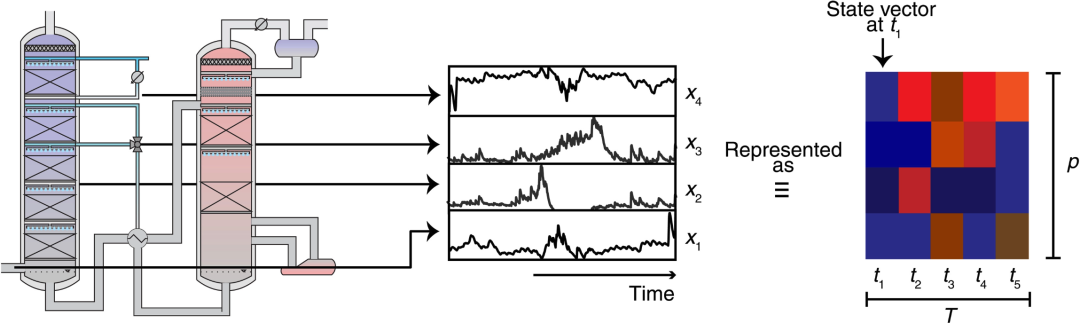 在这种表示法中,工场在给定时间 t 定义了一个 state 特征向量 x(t),其中 p 元素表示过程变量(如烟气温度和水洗温度)。