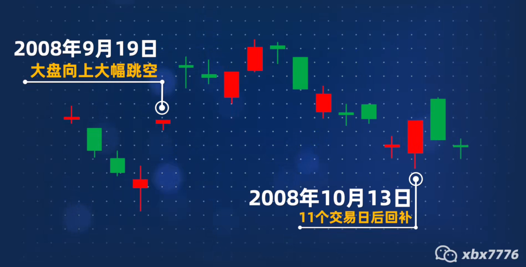 比如2008年9月19日大盘大幅向上跳空,11个交易日后(10月13日)回补缺口。