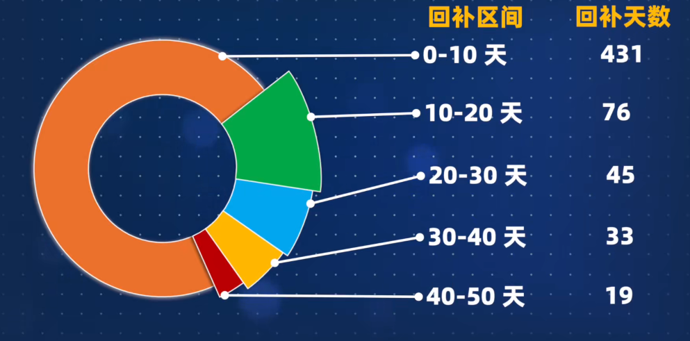 大多数回补都在50天内完成,也有少部分需要400天以上,平均回补时长84天。