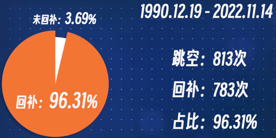从1990年12月19日到2022年11月14日,上证指数总共出现813次跳空。其中783次都回补了,概率高达96.31%。
