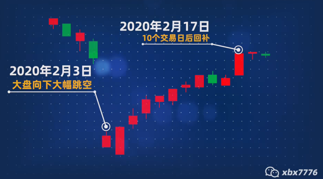 再比如2020年2月3日大盘大幅向下跳空,10个交易日后(2月17日)回补缺口。