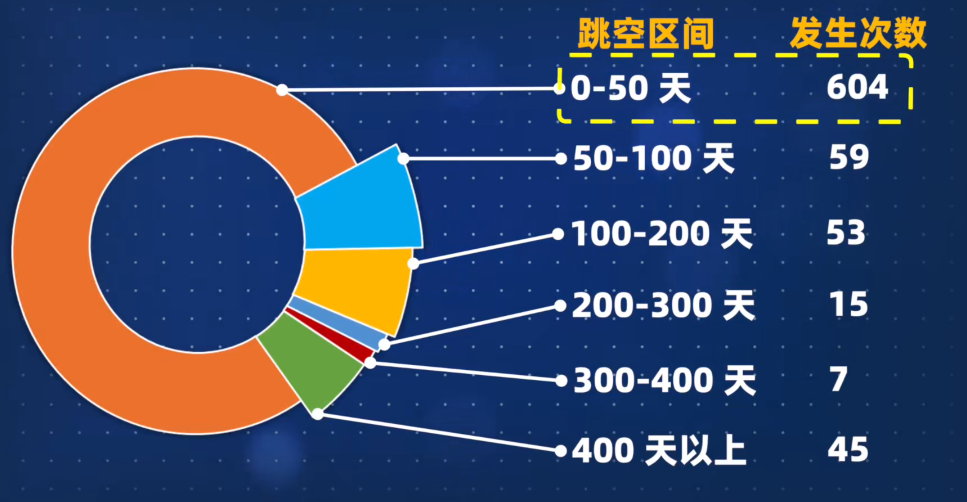 二、大部分跳空会在10天之内回补,少部分跳空回补时长在400天以上。