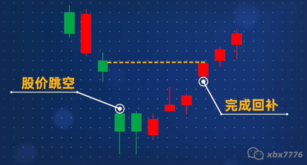 比如图中发生向下跳空,5个交易日后K线的最高价超过了跳空前K线的最低价,此时就完成了一次回补。