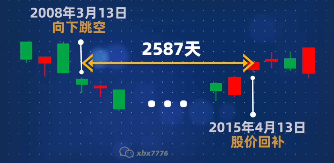 2008年3月13日上证指数向下跳空,直到15年的4月13日指数价格才重回4000点,完成回补,历时2587天。