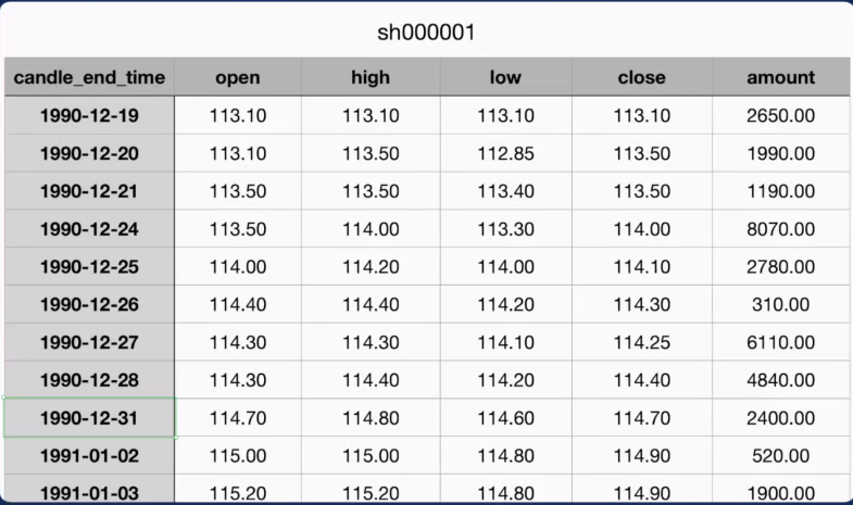 首先我们找来了上证指数的全部历史交易数据,包含了指数从90年上市至今每天的开高收低价格,非常的完备。