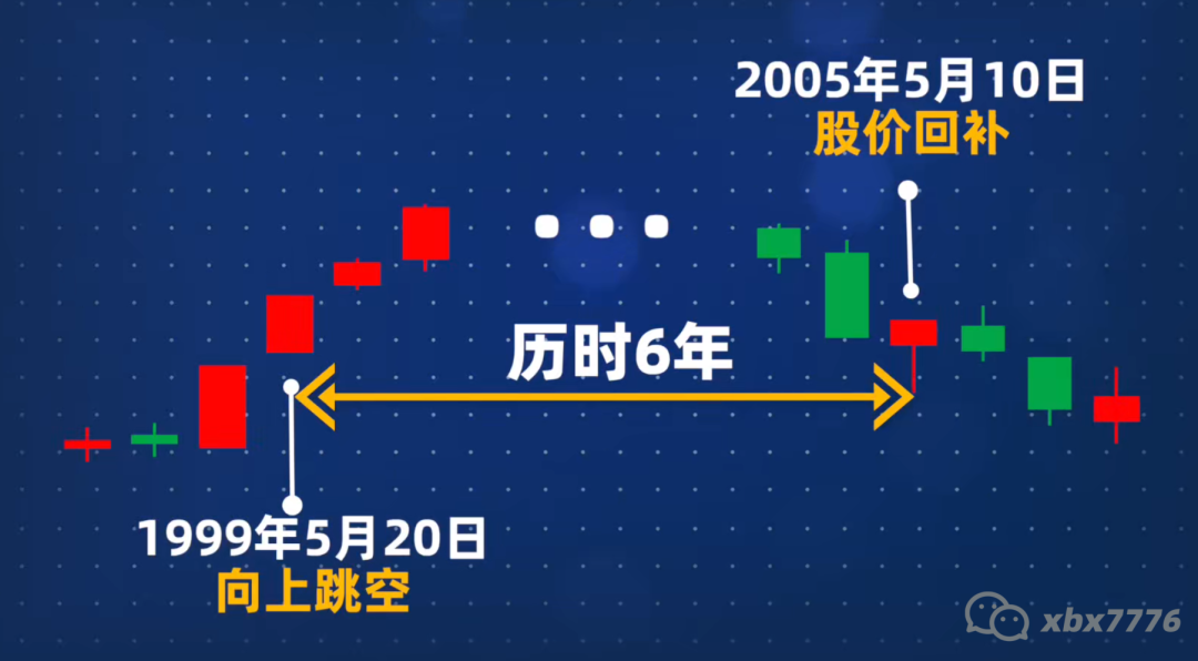 这看起来只是一次平平无奇的向上跳空,但随后指数价格一路上涨,直到2005年的5月10日才回补缺口,历时6年。