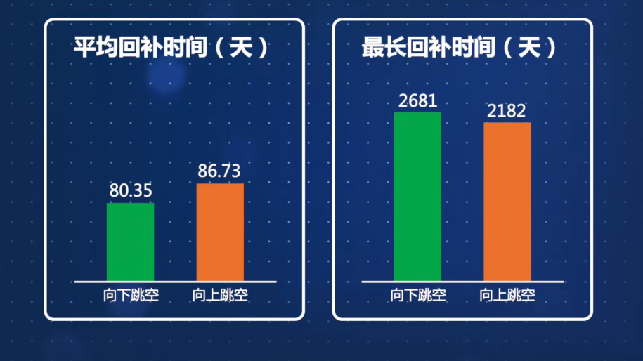 在最极端的案例中,向下跳空整整用了2681天才完成回补;而向上跳空用了