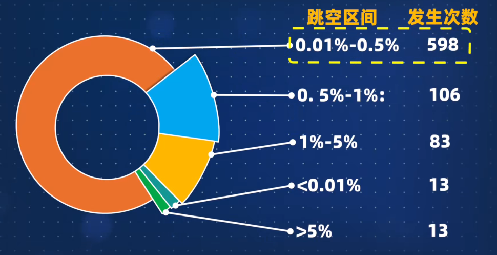 看了这么多的案例,我们发现每次跳空的幅度差距也极大。有些跳空连0.01%都没有,有些却高达10%。