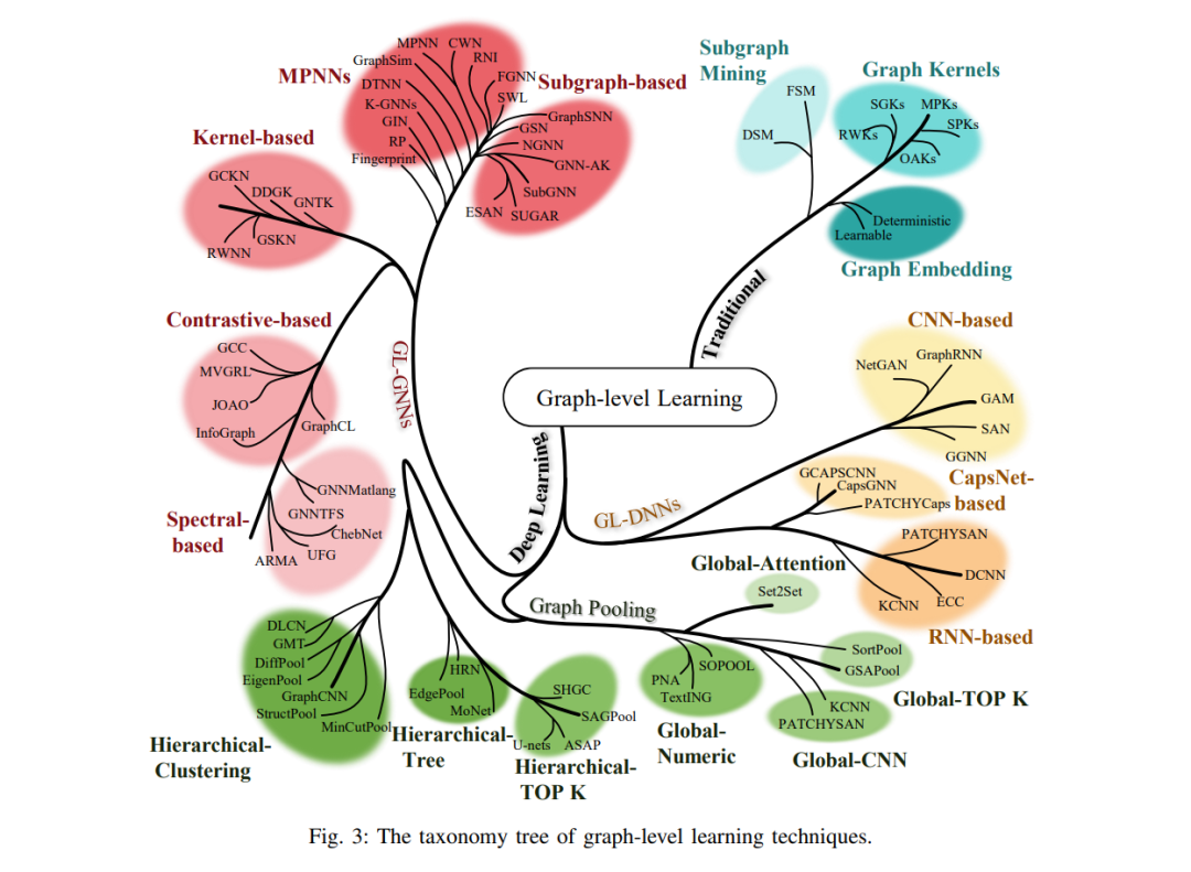 全面的分类法:本文提出了图级学习技术的全面分类法。具体来说,该分类涵盖了通过传统和深度学习方法进行的图级学习。