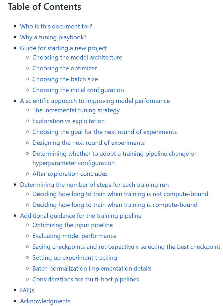 比如,你是不是经常会有疑惑到底该选择哪个优化器?一个batch放多少数据?超参数如何设置?难道真要网格搜索全实验一遍吗?最近,来自谷歌和哈佛大学的研究人员以非官方的名义发布了一本《深度学习调参套路》,把调参这件玄之又玄的事试图用科学的方法来解释,目前已收获超过1万个stars文档链接:https://github.com/google-research/tuning_playbook该项目由五名从事深度学习多年的科研人员和工程师合力编写,最早的甚至在2006年就开始写神经网络,涉及的领域也包括从语音识别到天文学的各种问题,并在过程中积累了大量的经验。
