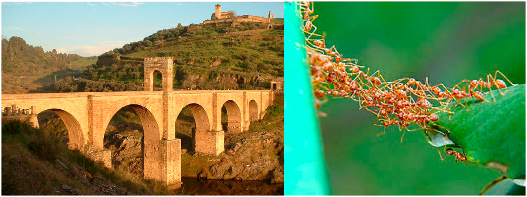 例如,在一个确定的顺序中,模型可能期望有固定数量的输入。我们不能期望主体(agent)有能力超越它们在训练期间学到的技能,但是一旦这些刚性配置被违反,模型就不会有好的表现,除非我们重新训练它们或者手动处理输入,使之与模型最初的训练配置一致。此外,随着所有这些进展,深度学习中令人印象深刻的壮举是被应用到复杂的工程项目中。例如,著名的AlexNet卷积神经网络架构(Krizhevsky et al. 2012)(见图1),在2012年赢得ImageNet竞赛之后,使深度学习成为计算机视觉界的焦点,它提出了一个精心设计的网络架构和一个精心校准的训练程序。现代神经网络通常更加复杂,需要一个横跨网络架构和精细训练方案的管道。像许多工程项目一样,在产生每一个结果时,都要付出很多劳动和微调。图1. AlexNet(Krizhevsky et al. 2012)的神经网络结构,它是2012年ImageNet竞赛的冠军。我们认为,深度学习的许多限制和副作用源于这样一个事实,即目前深度学习的实践与建筑工程类似。我们建造现代神经网络系统的方式类似于我们建造桥梁和建筑的方式,而这些设计是不具有适应性的。引用《控制论大脑》(The Cybernetic Brain,Pickering, 2010)一书作者Pickering的话说:“我所想到的大多数工程实例都是不具有适应性的。桥梁和建筑、车床和发动机、汽车、电视以及电脑,都被设计成对环境漠不关心,承受环境的波动,而不是适应环境。 最好的桥是一座不管天气如何都屹立在那里的桥。”集体智能(Collective Intelligence)在自然系统中发挥了很大的作用,我们看到由于自组织而涌现的适应性设计,这种设计对周围世界的变化非常敏感,反应迅速。自然系统适应并成为环境的一部分(见图2的比喻)。图2. 左图:位于阿尔坎塔拉的图拉真桥,由罗马人于公元106年建造(维基百科,2022)。
