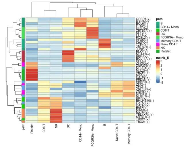 Heatmap( regulonActivity_byGroup_Scaled, name = "z-score" , col = colorRamp2(seq(from=-2 ,to=2 ,length=11 ),rev(brewer.pal(11 , "Spectral" ))), show_row_names = TRUE , show_column_names = TRUE , row_names_gp = gpar(fontsize = 6 ), clustering_method_rows = "ward.D2" , clustering_method_columns = "ward.D2" , row_title_rot = 0 , cluster_rows = TRUE , cluster_row_slices = FALSE , cluster_columns = FALSE )image-20230131191806586 可以看到,确实每个单细胞亚群都是有 自己的特异性的激活的转录因子。