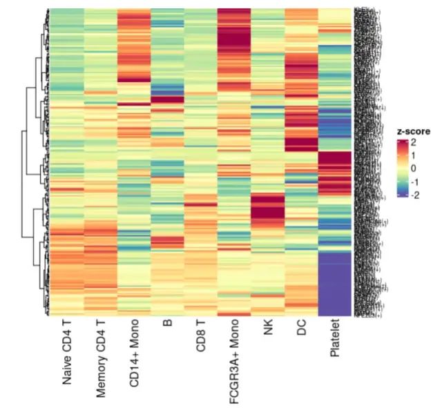 ### 4.1. TF活性均值 # 看看不同单细胞亚群的转录因子活性平均值 # Split the cells by cluster: selectedResolution "celltype" # select resolution cellsPerGroup cellTypes[,selectedResolution])# 去除extened regulons sub_regulonAUC dim(sub_regulonAUC)# Calculate average expression: regulonActivity_byGroup function (cells) rowMeans(getAUC(sub_regulonAUC)[,cells]))# Scale expression. # Scale函数是对列进行归一化,所以要把regulonActivity_byGroup转置成细胞为行,基因为列 # 参考:https://www.jianshu.com/p/115d07af3029 regulonActivity_byGroup_Scaled center = T , scale=T )) # 同一个regulon在不同cluster的scale处理 dim(regulonActivity_byGroup_Scaled)#[1] 209 9 regulonActivity_byGroup_Scaled=na.omit(regulonActivity_byGroup_Scaled)热图查看TF分布: