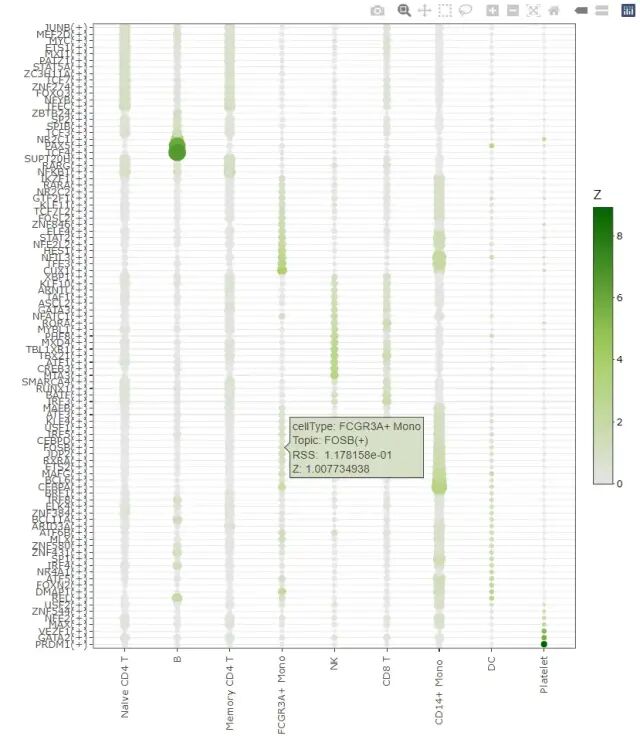 4.2 rss查看特异TF 不过,SCENIC包自己提供了一个 calcRSS函数,帮助我们来挑选各个单细胞亚群特异性的转录因子,全称是:Calculates the regulon specificity score