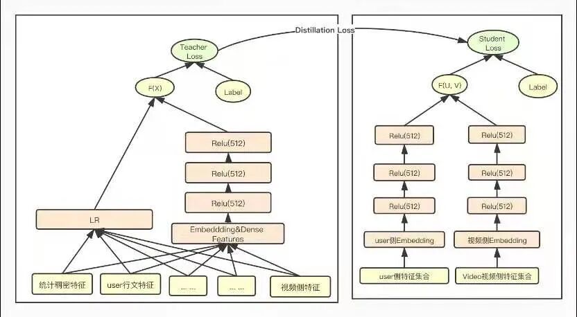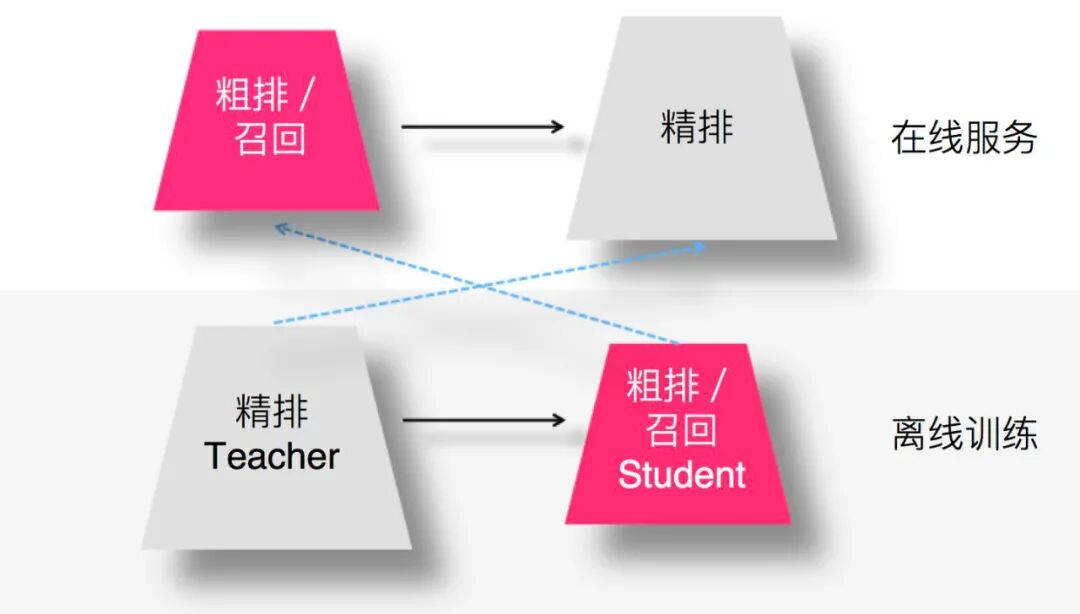 2.2 模型召回/粗排环节采用知识蒸馏由于模型召回或者粗排环节,作为精排的前置环节,需要在准确性和速度方面找到一个平衡点,在保证一定推荐精准性的前提下,对物品进行粗筛,减小精排环节压力。所以,这两个环节本身,从其定位来说,并不追求最高的推荐精度,就算模型效果比精排差些,这也是完全可以接受的,毕竟在这两个环节,如果准确性不足可以靠返回物品数量多来弥补。而模型小,速度快则是模型召回及粗排的重要目标之一。这就和知识蒸馏本身的特点对上了,所以在这里用特别合适。