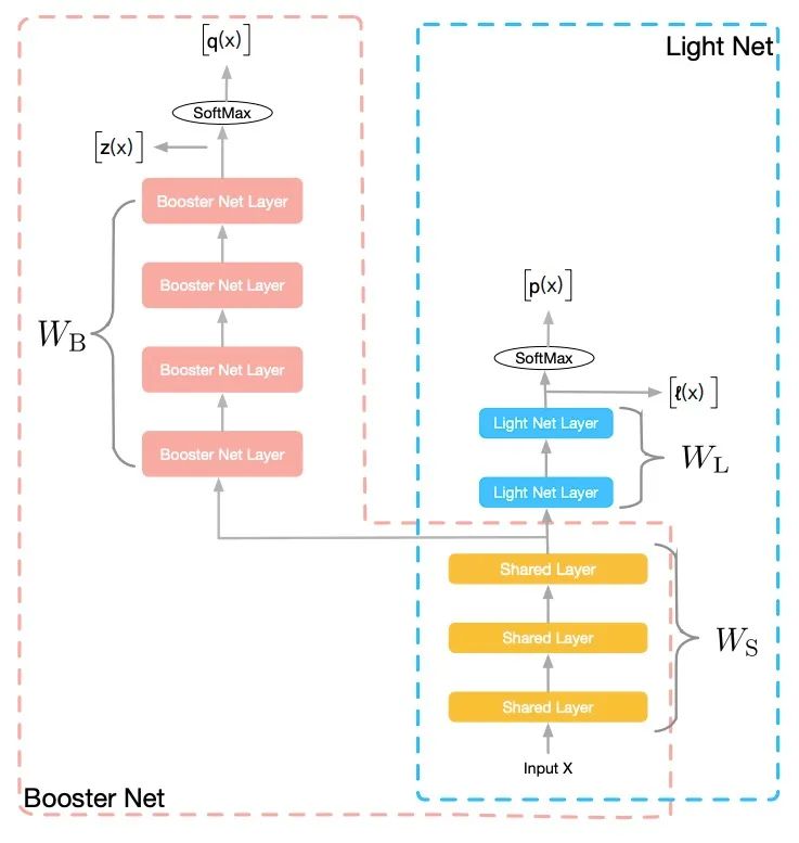 助推器网络和轻量网络共享部分层的参数 ,共享的参数可以根据网络结构的变化而变化。在神经网络中,低层可以用来学习信息表示,低层网络的共享,可以帮助轻量网络获得更好的信息表示能力。如上图所示,训练阶段,我们同时学习两个网络:Light Net 和Booster Net,两个网络共享部分信息。我们把大部分的模型理解为表示层学习 和判别层学习 、