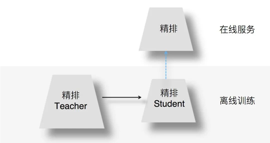2.1 精排环节采用知识蒸馏为何在精排环节采用知识蒸馏?我们知道,精排环节注重精准排序,所以采用尽量多的特征和复杂模型,以期待获得优质的个性化推荐结果。但是,这同时也意味着复杂模型的在线服务响应变慢。若承载相同的流量,需要增加在线服务并行程度,也就意味着增加机器资源和成本。因此,如何在精准排序和机器资源之间做均衡呢?我们可以通过在精排环节采用知识蒸馏技术实现一个既有较好的推荐质量,又能有快速推理能力的模型。