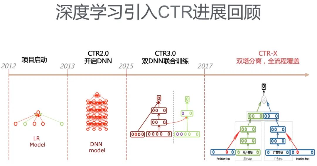 Zhu J, Liu J, Li W, et al. Ensembled CTR Prediction via Knowledge Distillation[C]//Proceedings of the 29th ACM International Conference on Information & Knowledge Management. 2020: 2941-2958. 3.1.5 百度CTR 3.0 双DNN联合训练这是2017年百度当时商务搜索智能交互部负责人刘斌新在其PPT《AI筑巢:机器学习在百度凤巢的深度应用》中提到的类似知识蒸馏的技术。由于百度极少对外公开自己的技术,放在这里是想让大家了解一下,百度广告CTR模型的发展历史。