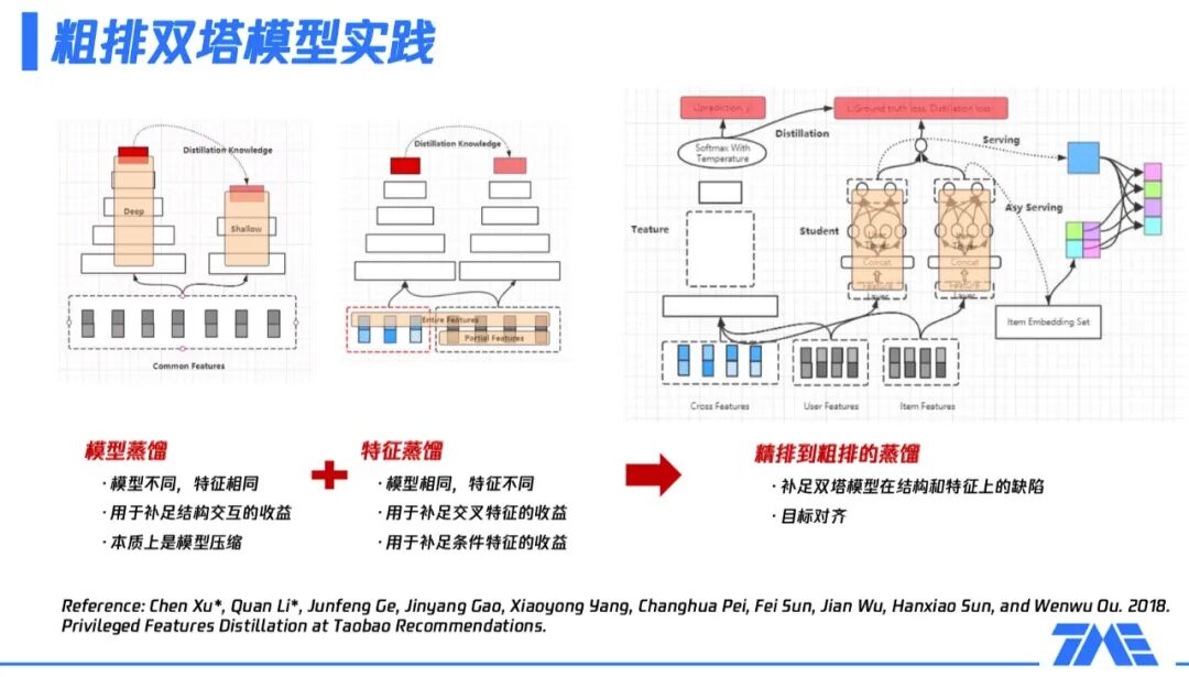 双DNN排序模型:在线知识蒸馏在爱奇艺推荐的实践,地址:https://mp.weixin.qq.com/s/ZNjC30F28uX2lBkHBAAU3g 3.2 粗排环节应用知识蒸馏 3.2.1 腾讯-全民K歌粗排双塔模型实践这是一个将“目标蒸馏-logits方法“应用到推荐系统领域的实践。 粗排夹在召回跟精排之间,它的定位是什么?相比于召回,粗排更强调排序性,也就是更强调topk内部的排序关系;相对于精排,粗排更强调性能,因为精排通常有非常复杂的网络结构,非常大的参数量,这也意味着它在实际应用的过程中比较难去处理一个较大规模量级的候选集的打分,这时粗排就必须要解决这个问题,所以它在性能上会相较于精排有更多的要求。