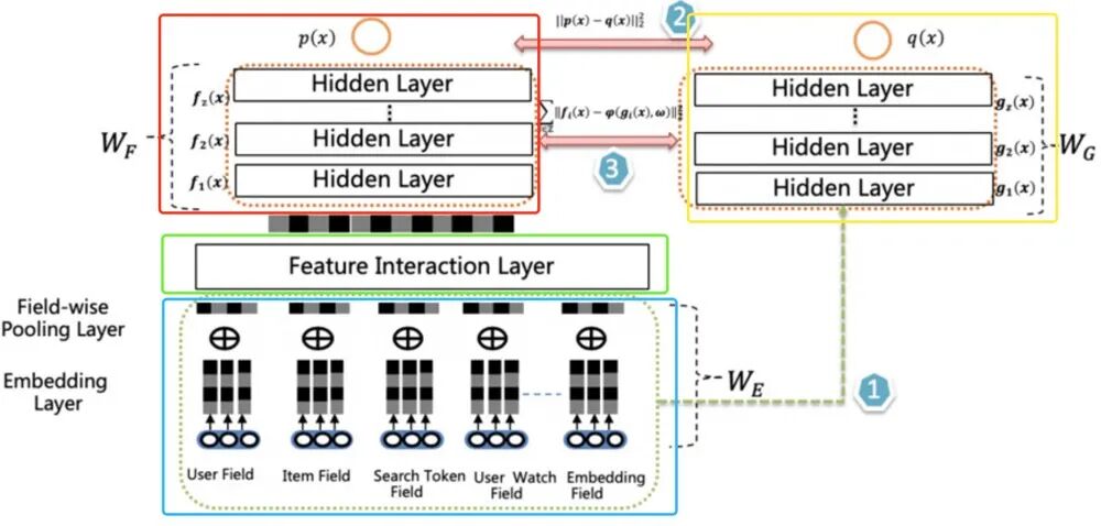 (2) Fine-Tune Teacher网络(红框)和Student网络(黄框)share底层特征参数(蓝框),teacher网络多了Feature Interaction Layer层(该层是teacher网络的核心,可以容纳各种特征交互)。